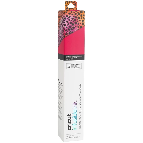 Ce set Infusible Ink Cricut contient 2 feuilles de 30,5 x 30,5 cm à motifs Guépard / Arc-en-ciel. Si vous utilisez l’infusible Ink avec la machine Cricut Maker, il vous faudra utiliser un tapis de coupe StandardGrip Cricut Maker. Pour assurer le bon maintient de vos transferts sur vos tissus, vous pouvez utiliser le Ruban adhésif résistant à la chaleur de chez Cricut