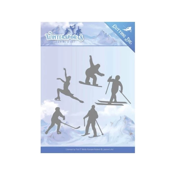 Matrice de découpe sur le thème des sports d’hiver avec un joueur de hockey sur place, une patineuse artistique, un snowboardeur et 2 skieurs. 5 pièces Dimensions du hockeyeur5,5cm x 4,5cm Dimensions du snowboardeur3,6cm x 4,5cm