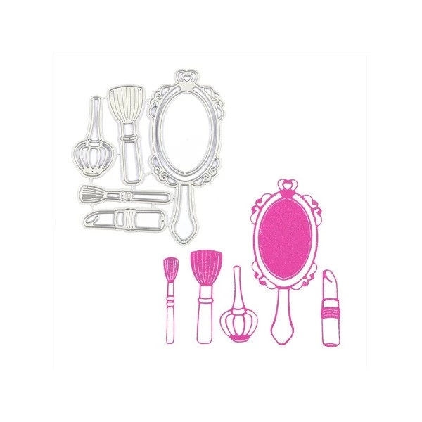 Matrice de découpe scrapbooking sur le thème de la beauté féminine avec ces jolies dies maquillage 5 pièces Dimensions du miroir10,3cm x 4,5cm Dimensions du rouge à lèvre4,6cm x 1,4cm