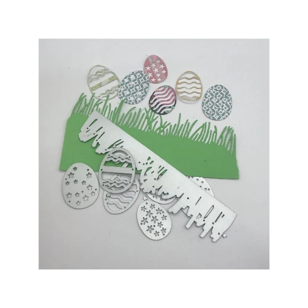 Die de scrapbooking sur le thème de Pâques, ces jolies oeufs cachés dans l’herbe promettent une vraie partie de plaisir pour cette fête. 7 pièces Dimension de la frise13,9cm x 3cm Hauteur des oeufs de 3cm à 3,5cm