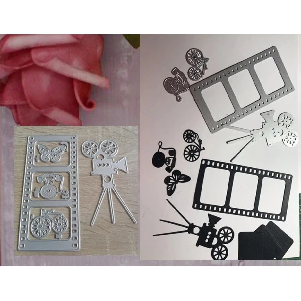 5 dies scrapbooking tournage de cinéma vintage Dimensions du négatif13,1cm x 6,2cm Dimensions de la caméra10,2cm x 4,6cm Dimensions du papillon3,5cm x 2,4cm