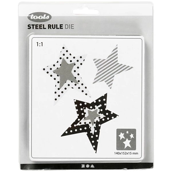 Modèle Etoiles (4 formes) pour la découpe de motifs dans des matériaux épais comme la mousse EVA, le papier cartonné métallisé, le papier cartonné épais, le cuir, le liège, le feutre ou le papier. À utiliser avec les machines à couper et à embosser no. 11761 et 11792.