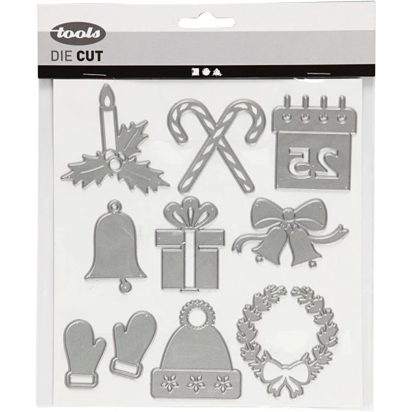 Modèle pour la découpe et l’embossage de motifs Motifs de Noël sur de la mousse EVA, du plastique fin, du papier cartonné métallisé, du papier cartonné épais ou du papier. À utiliser avec les machines à couper et à embosser no. 11761, 11792 et 11799 et également avec la plaque en silicone – Article no. 11762.