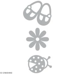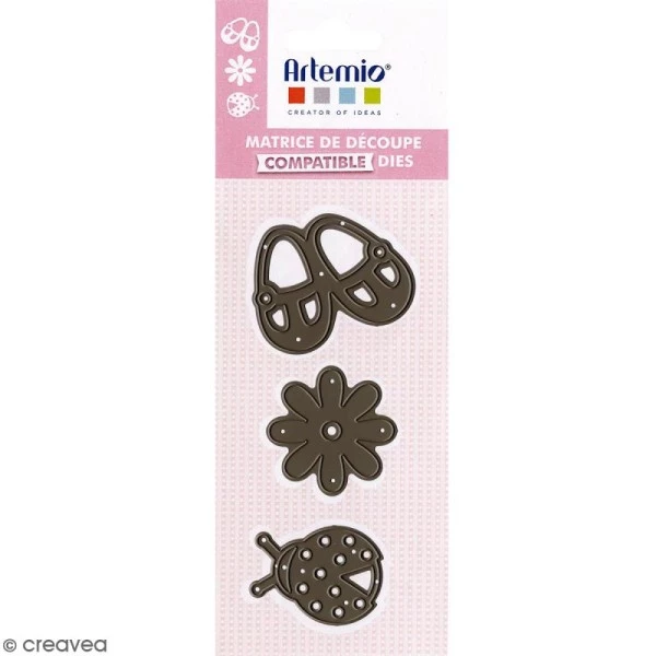 Ce type de die Artemio Coccinelle Fleur & Chaussons (3 matrices), appelé également pochoir ou matrice de découpe, s’utilise avec la plupart des machines de découpe et d’embossage. Vous pouvez ainsi réaliser vos propres coupes et créer de beaux embellissements sur le thème Coccinelle Fleur & Chaussons. De quoi sublimer vos cartes, pages de scrapbooking, photographies, inscriptions, etc.