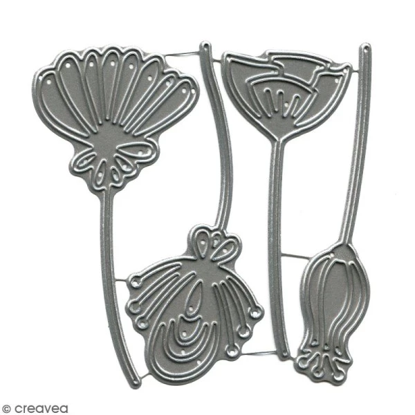 Lot de 4 dies Fleurs stylisées de Florilèges Design. Ces matrices de découpe vous permettront de découper plusieurs formes du modèle sélectionné, à l’infini, et cela sur de nombreux supports. Cela vous sera parfait pour des projets de décoration, de carterie, de scrapbooking, etc.