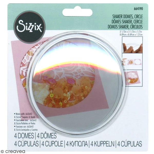 Description de Dômes Shaker Sizzix – Cercles – 8,9 x 8,9 x 1,2 cm – 4 pcs