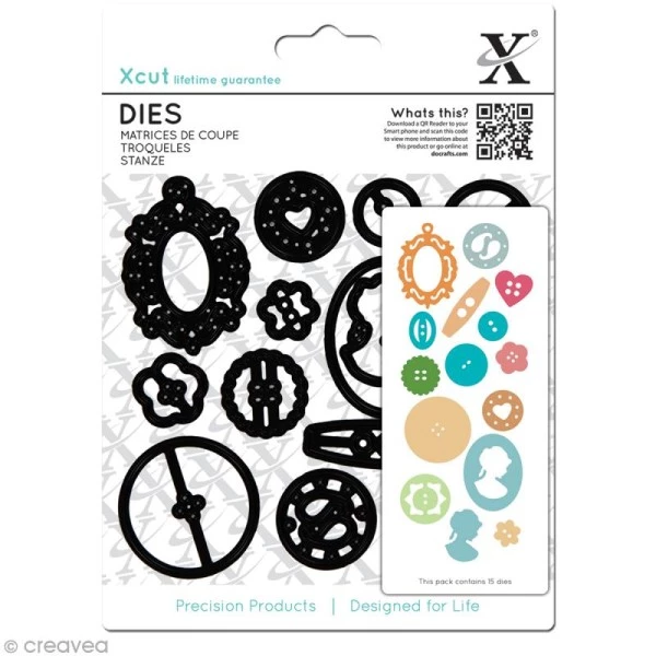 Ensemble de 15 dies de coupe X Cut Boutons, issus de la collection Sew lovely. Ces dies vous serviront à découper des formes grâce à votre machine de scrapbooking. L’avantage avec ces matrices de découpe, c’est qu’elles disposent d’une lame sur le bord intérieurvous pourrez ainsi savoir avec exactitude où votre découpe sera effectuée sur votre papier (parfait pour les photographies, inscriptions, etc). Les dies Boutons Sew lovely de X Cut permettent de créer vos propres dies cuts.