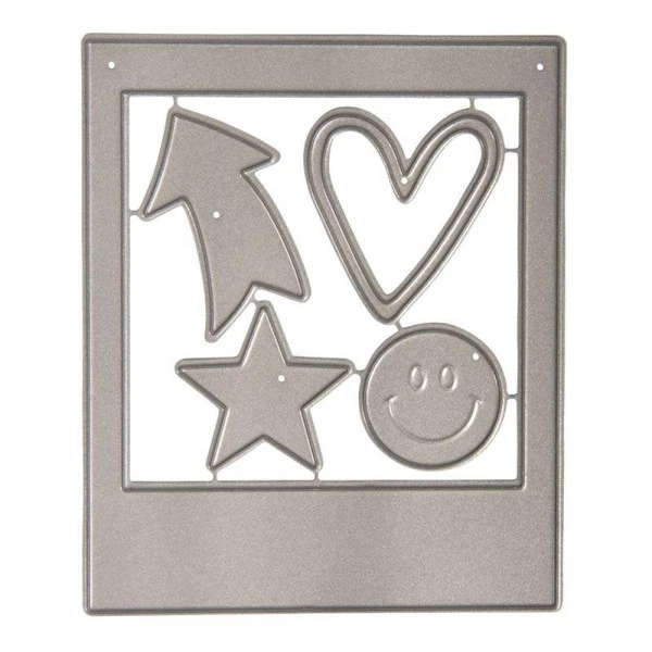 Matrice de découpe et d’embossage en forme de polaroïd mesurant 7 cm x 8,5 cm ainsi qu’une flèche, une étoile, un coeur et un smiley. Idéal pour décorer vos créations de papeterie, un faire part de naissance ou une invitation à un anniversaire d’enfant, ce gabarit de découpe pour machine de découpe vous permet de répéter ce même format sur des supports différentsen papier cartonné, métal, feutrine, cuir, plastique dingue, vinyle… La matrice de découpe Polaroïd en métal est compatible avec toutes les machines de découpe. Mode d’emploiPlacez une plaque de découpe sur le plan de travail, placez votre matrice de découpe par dessus. Puis placez votre papier cartonné (ou autre matériau). Placez votre deuxième plaque de découpe par-dessus. Puis mettez l’ensemble dans votre machine, tournez la manivelle dans le sens des aiguilles d’une montre pour faire rouler l’ensemble à travers la machine. Récupérez le tout à l’autre extrémité de la machine, et récupérez votre papier cartonné, taillé au format voulu. Vous n’avez plus qu’à le détacher doucement. DimensionsPolaroïd de 7 cm x 8,5 cm, Flèche de 3,5 cm, Coeur de 3 cm, étoile de 2,5 cm et smiley de ⌀ 2 cm.